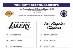 体育资讯12月21日讯 湖人和快船官方公布了今日比赛的首发阵容。