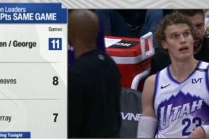 本赛季双人组同场砍下25+场次,基昂特·乔治和马尔卡宁11场领跑全联盟,第二的是东契奇和里夫斯的8场,第三是约基奇和穆雷的7场。