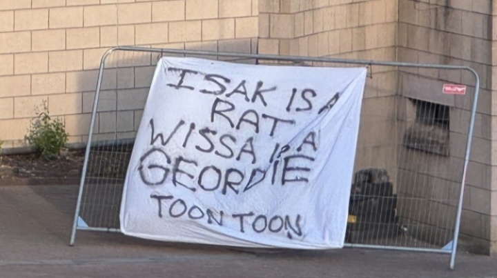 标语上写着,Isak is a rat, Wissa is a Geordie, Toon Toon.(翻译参考:伊萨克是叛徒,维萨是自家人,纽卡!纽卡!)