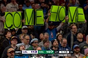 独行侠球迷对着东契奇举大标语:Come Home(回家吧)!