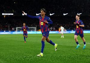 比赛的僵局在下半场被打破。达尼·奥尔莫和拉菲尼亚先后利用对手的失误取得进球,展现了球队的韧性和效率。比赛的高潮来自亚马尔,他不仅在前场逼抢中制造了首个进球机会,更亲自打入一记技惊四座的世界波锁定胜局。