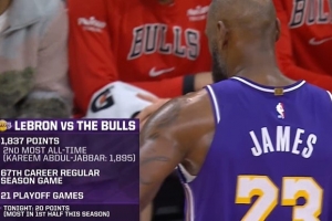 詹姆斯生涯对阵公牛1837分仅次于贾巴尔1895分