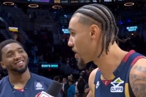 体育资讯1月31日讯 在昨天骑士主场129-99大胜湖人的赛后,在场边采访环节,泰森打断记者对米切尔的采访关于詹姆斯的提问,并表示这里现在这里是米切尔的城市。