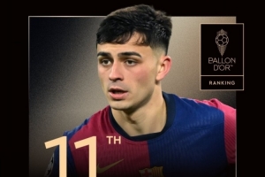 体育资讯9月23日讯 2025年金球奖排名出炉,巴萨中场佩德里排在第11位。