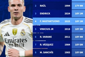 体育资讯9月24日讯 在本轮西甲皇马4-1击败莱万特的比赛中,马斯坦托诺破门,成为队史西甲破门第四年轻的球员,以下为具体榜单: