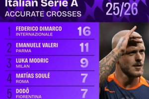 本赛季意甲精准传中排名: