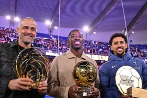 登贝莱在获得金球奖,马尔基尼奥斯作为队长则拿着巴黎的最佳男足俱乐部奖,恩里克则获得苏格拉底奖,巴黎官推晒出三人三奖杯的合影并写道:“集体的力量。”