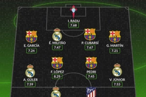中场:居勒尔(皇马)7.59分、费尔明(巴萨)8.29分、佩德里(巴萨)7.45分、维尼修斯(皇马)7.53分