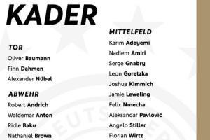 体育资讯10月02日讯 德国队公布了新一期世预赛名单,沃尔特马德、维尔茨领衔,基米希、格雷茨卡、格纳布里在列,萨内落选。