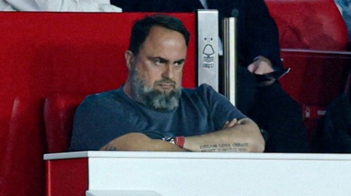 看台上,诺丁汉森林老板、希腊船王马里纳基斯十分郁闷,死亡凝视+抱头怒目,看着场上的比赛。