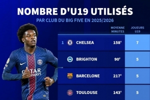 体育资讯10月7日讯 德国转会市场统计了本赛季五大联赛球队使用U19球员的数量,并列出榜单,切尔西7人居首、巴萨、巴黎等队5人次席。