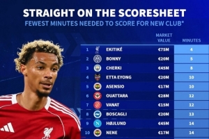 体育资讯10月8日讯 德国转会市场统计了今夏新援攻入处子球的时间,并排出最快处子球榜单,埃基蒂克4分钟攻入首球居首。