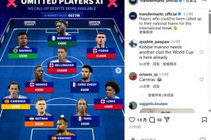 体育资讯10月11日讯 德转列出落选本期国家队的最贵阵容,总价高达6.77亿欧。