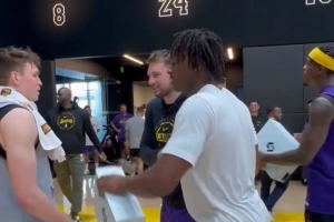 体育资讯10月11日讯 今日,湖人官方Instagram晒出一段昨日东契奇在训练后向全队赠送自己的签名球鞋的花絮视频。