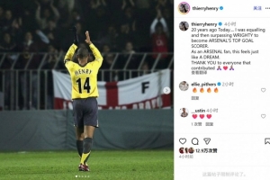 亨利配文写道:“20年前的今天,我先是追平,此后超越了赖特,成为阿森纳队史第一射手。作为一名枪手球迷,这感觉就像做梦。感谢大家的付出。”