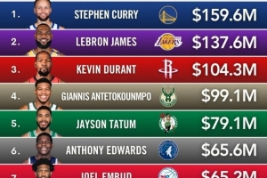 Boardroom列出本年度NBA球星收入排行(赛场收入+代言收入):,具体如下: