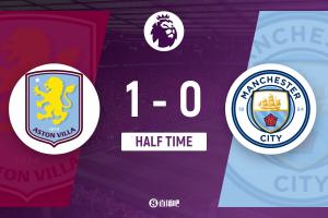 上半场伤停补时3分钟,半场结束,曼城暂0-1维拉。