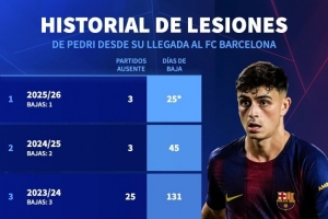 佩德里近5个赛季伤病情况: