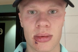 哈兰德在今日通过社媒晒出自拍照,可以清洗看到嘴唇下的伤口,他对此解释称:“刚刚被公交车门给撞了👍缝了三针😂”