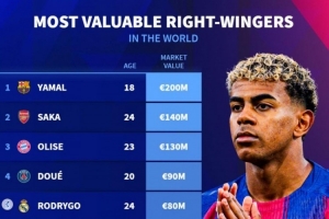 体育资讯11月3日讯 德转列当前世界足坛右边锋身价排行,亚马尔2亿欧居首,萨卡1.4亿欧第二,奥利塞1.3亿欧第三。