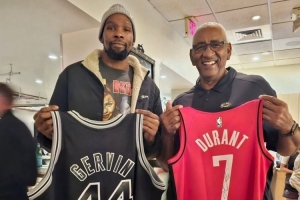 赛前,杜兰特和马刺名宿“冰人”乔治-格文交换球衣。