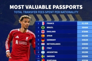 体育资讯9月9日讯 德转统计了今年夏窗各国球员的总转会费榜单,法国球员10.2亿欧元居首,巴西第二、英格兰第三。