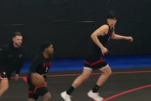 视频当中,杨瀚森接球上篮打进,开拓者众将轻松备战氛围融洽。