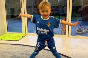 体育资讯11月19日讯 热刺中场麦迪逊在今日通过社媒晒出自己儿子的动态,后者穿上了贝林厄姆在皇马的5号球衣。