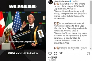 体育资讯9月11日讯 国际足联主席因凡蒂诺更新社媒动态,宣布世界杯球票销售即将开始。