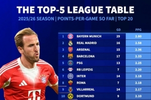 体育资讯11月21日讯 五大联赛战火即将重燃,《转会市场》也统计了本赛季五大联赛球队场均拿分情况,拜仁独自领跑。