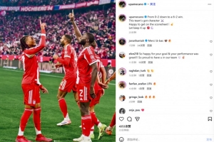 体育资讯11月23日讯 拜仁在本轮德甲让二追六、成功逆转弗赖堡,于帕梅卡诺也斩获进球。