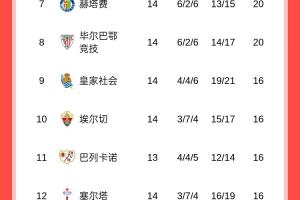 体育资讯12月1日讯 西甲第14轮结束大部分比赛,最新积分榜如下: