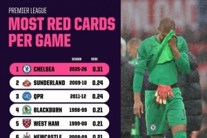 平均3场1张红牌!切尔西本赛季场均红牌0.31张,英超历史最多