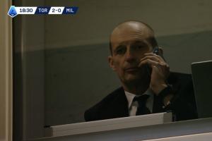 体育资讯12月09日讯 意甲第14轮米兰客战都灵,米兰在第17分钟0-2落后。随后导播镜头捕捉到,因红牌停赛的阿莱格里只能在看台通过电话指挥,随后米兰成功连扳3球!