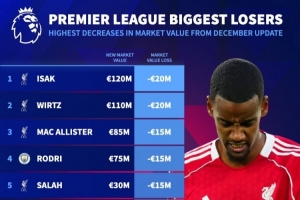 体育资讯12月9日讯 德转更新英超球员身价,伊萨克、维尔茨均-2000万欧,为本次更新身价下降最多的英超球员。