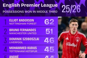本赛季英超中场区域夺得球权排名: