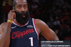 快船客场VS火箭,第四节哈登打进3+1。转播方统计,哈登本赛季已经10次3+1,领跑全联盟。