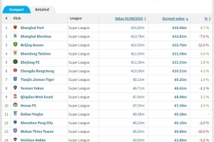 德国转会市场网(Transfermarkt.de)2025年中超联赛身价年终例行更新今天完成。球员方面,浙江队的米特里策身价维持在400万欧元,位于中超身价榜首位。山东泰山的克雷桑身价从400万欧降到350万欧,上海海港队的维塔尔则从200万欧上涨到350万欧,同为350万欧的还有上海海港的莱昂纳多,这三名球员并列身价榜第二名。北京国安的古加则从350万欧降到了280万欧,排名第五。青岛西海岸的里切利、深圳新鹏城的韦斯利、天津津门虎的哈达斯同为200万欧,并列第六。云南玉昆的布尔克、青岛西海岸的阿齐兹、成都蓉城的古尔芬克尔和罗慕洛四人同为180万欧,并列第九。