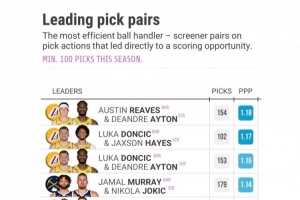 赛季至今,打过至少100次挡拆配合的二人组,效率最高的是里夫斯和艾顿,每回合1.18分,排在第2的是东契奇和海斯,每回合1.17分,排在第3的还是一对湖人组合,东契奇和艾顿,每回合1.16分。